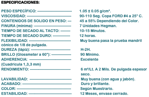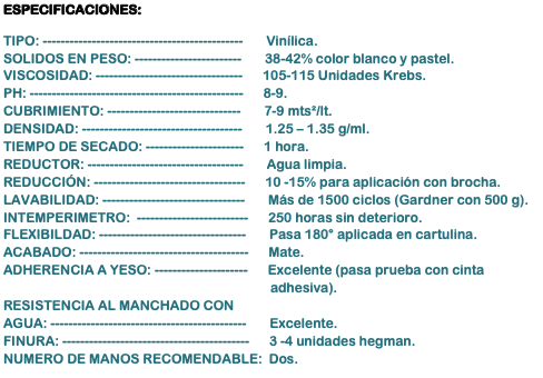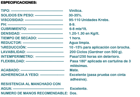 Pintura emulsionada, a base de resinas acrílicas que presentan buena lavabilidad y para uso en interiores y exteriores, Tienen gran resistencia al almacenamiento. Las características del olor, retención del color; presenta buena resistencia a la abrasión y a lavado después de 7 días de aplicada. Se limpia de manchas de grasa, aceite manteca, etc. Fácilmente con agua y jabón.