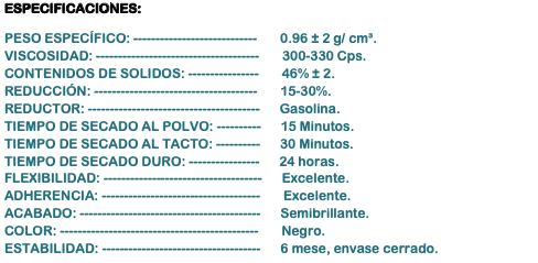 Es un esmalte económico a base de resinas bituminosa modificada. Proporciona una protección efectiva en las partes metálicas en que se utiliza ya que protege contra polvo, grasa, lodo, suciedad y resiste al ataque químico moderado (humos, corrosivos, salinidad, humedad, etc.) Se recomienda para chasises, radiadores, estructuras metálicas y cualquier superficie que desee recubrir de forma económica en color negro.