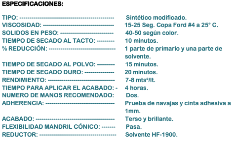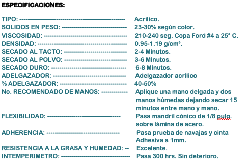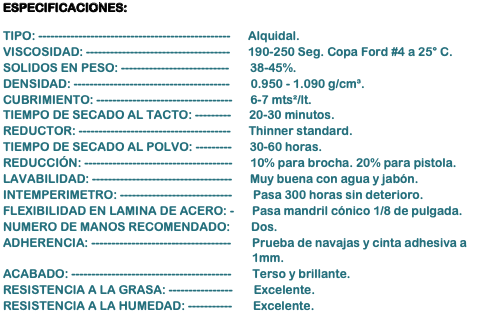 Es un esmalte de muy alta calidad, que tiene gran poder cubriente y brillo intenso, Su flexibilidad y adherencia sobre superficies comunes es excelente, brinda un rendimiento elevado, magnifica protección y excelente acabado.