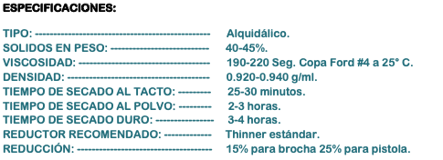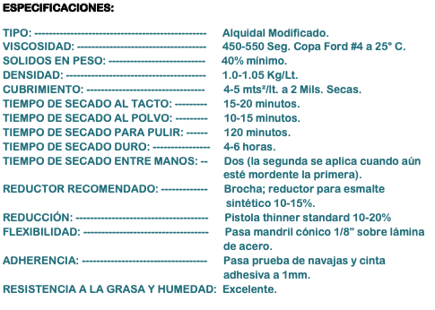 Es un esmalte alquidálico de muy alta calidad que presente excelente nivelación y rápido secado. Tiene gran poder cubriente, brillo intenso. Su flexibilidad y adherencia a superficies comunes es excelente; brinda un rendimiento elevado y magnifica protección. Se puede emplear en interiores y exteriores y en casos donde la intemperie sea fuerte, se recomienda el empleo de un primer.