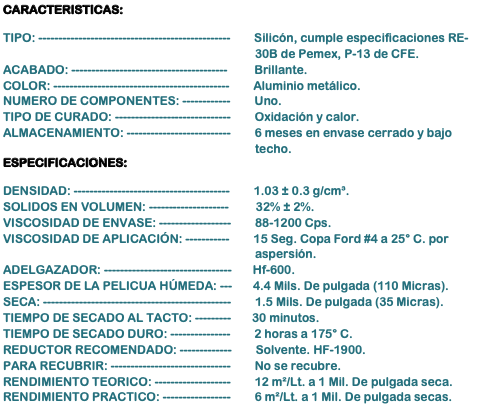Acabado formulado a base de resinas de silicón modificadas y pigmentos con polvo de aluminio y dióxido de silicio para ofrecer una alta protección a superficies sometidas a altas temperaturas.