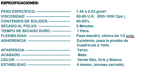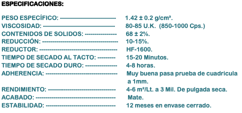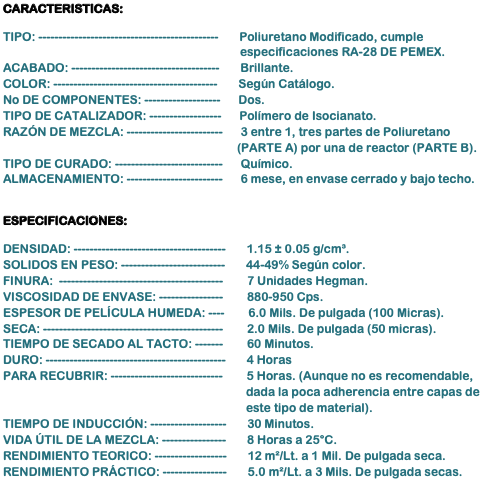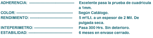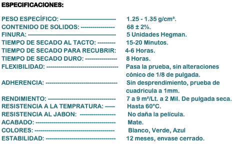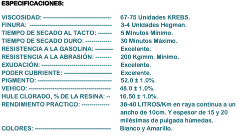 Es un recubrimiento formulado a base de resinas alquidales, pigmentos resistentes a la luz solar, y un alto contenido de Hule Clorado, lo cual le permite ofrecer magnífica resistencia a la acción abrasiva originada por el tráfico intenso, rápido secado y alta resistencia al intemperismo prolongado.