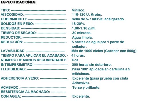 Recubrimiento acrílico de color blanco emulsionado; se utiliza para sellar superficies porosas y presenta fuerte adherencia, aún sobre pinturas viejas, debidamente preparadas. No deja olores ni imparte sabores a productos comestibles que están en la habitación donde fue aplicado, siempre y cuando se aplique con la ventilación adecuada. Posee buen brocheo y nivela fácilmente dando un acabado terso. Se aplica como impermeabilizante si se coloca entre la superficie a impermeabilizar y otra capa de cualquier recubrimiento. Como su nombre lo indica se utiliza en paredes nuevas para sellar la absorción del acabado y ahorrar pintura. Debido a su excepcional adhesión, se emplea entre las losas y acabados de cemento como base para la aplicación de yeso o aplanado, asegurando un mejor flujo de salitre y mayor adherencia del siguiente roboque.