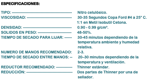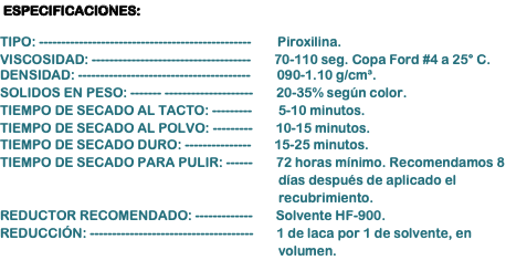 Recubrimiento a base de Piroxilina que presenta secado rápido y gran durabilidad; con buena resistencia a la abrasión a los lavados con ciertos agentes químicos suaves tales como el alcohol, la gasolina, ácidos y álcalis, diluidos, etc.