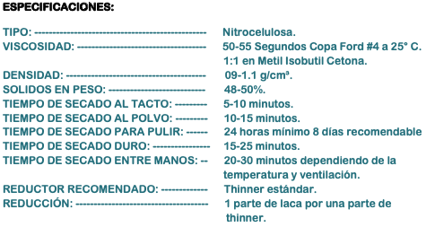 Recubrimientos a base de nitrocelulosa que presenta una calidad aceptable, buena adhesión, poder cubriente y aspecto. Son muy utilizados para pintar muebles, juguetes maquinaria, madera, etc. Se puede usar sobre primario, ya sea sintético o de nitrocelulosa, pero también se puede usar sin fondo de ninguna clase, no se recomienda usar con laca auto-motiva ni acrílica, ya que disminuirá la calidad de estás.