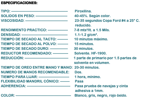 Este primer se utiliza cuando se desea un secado rápido, para dar el acabado inmediatamente. Su adherencia y flexibilidad son buenas, su durabilidad es grande, dependiendo de la preparación de la superficie, aplicación y condiciones de trabajo, se aplica por aspersión sobre superficies metálicas perfectamente limpias.