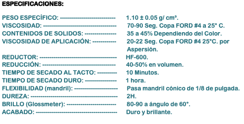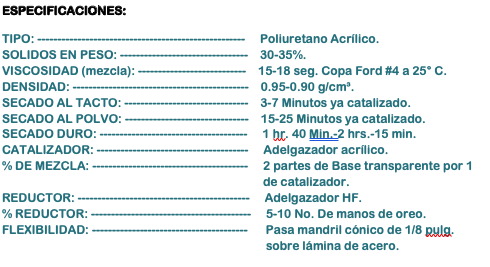 Recubrimiento de acabado para superficies metálicas, con excelentes características de durabilidad, alto brillo (después de pulir), retención del color, estabilidad al almacenamiento; buena resistencia a los agentes químicos suaves. Posee una mayor durabilidad que las lacas de nitrocelulosa y requiere e menos imprimaciones, debido a que tiene un alto contenidos de sólidos a la viscosidad de la aplicación.