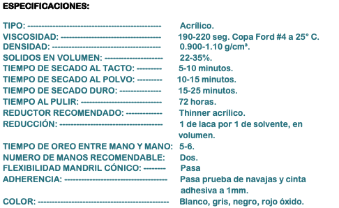Es un esmalte anticorrosivo de secado al aire, formulado a base de resinas alquidálicas estirenadas que le permiten un secado extra-rápido. Está diseñado principalmente para ayudar a fabricantes de mediana capacidad, que no dispone de horno para secar pintura y necesitan un producto que tenga las propiedades de un esmalte, pero con el secamiento de una laca.